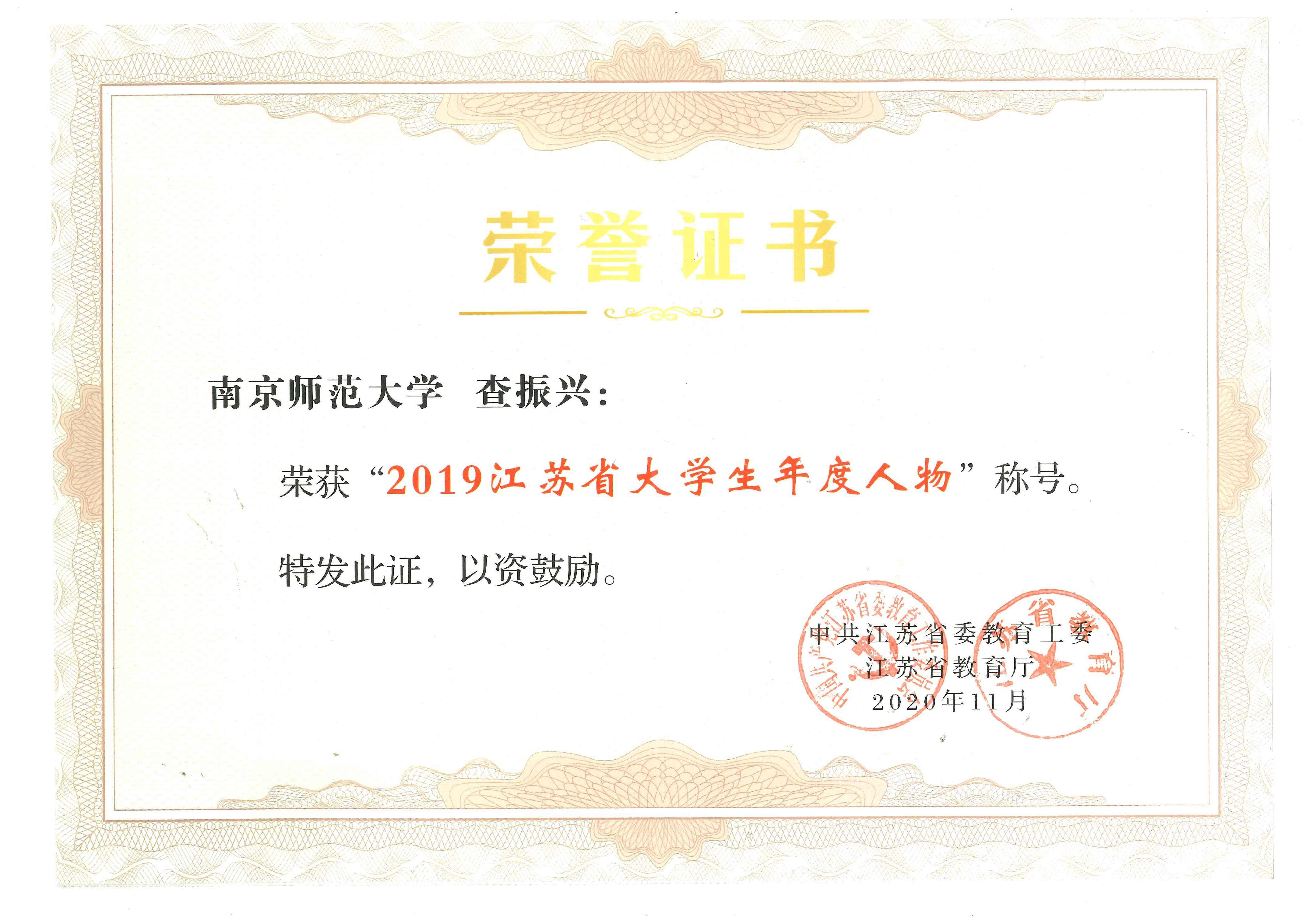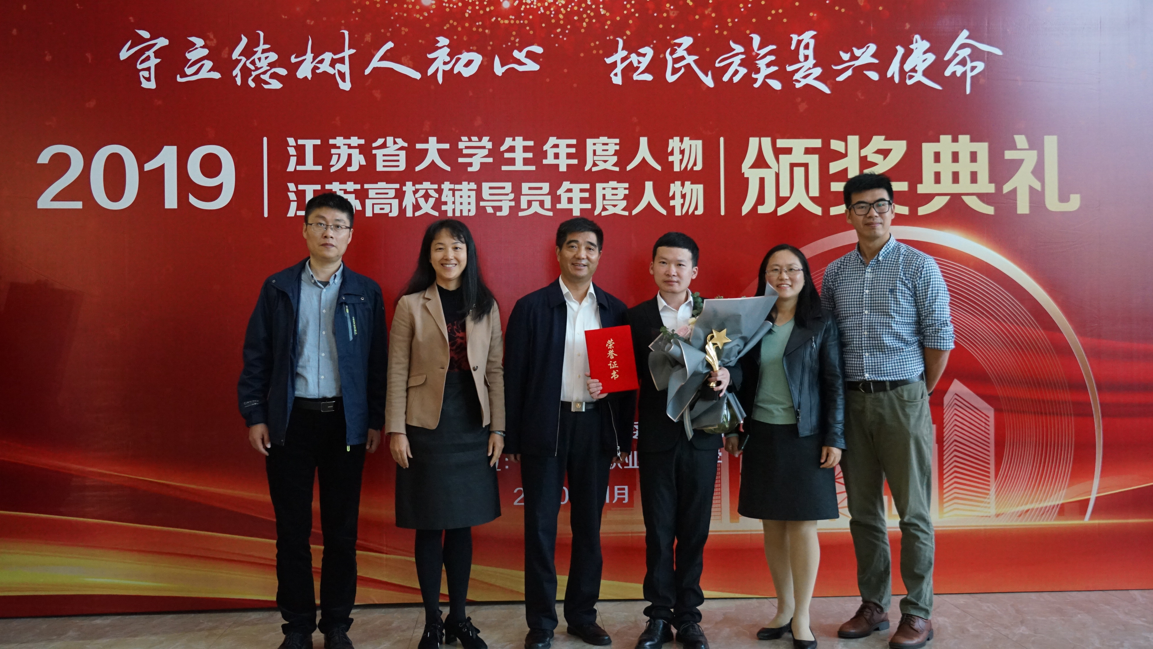 11月15日下午,由中共江苏省委教育工委、江苏省教育厅主办的2019江苏省大学生年度人物和高校辅导员年度人物颁奖典礼在南京工业职业技术大学举行。我校化学与材料科学学院研究生查振兴同学获“2019江苏省大学生年度人物”称号,物理科学与技术学院党委副书记、辅导员邵新一老师获“2019江苏省高校辅导员年度人物”提名奖。我校党委常委、组织部部长、统战部部长贲国栋,学工处、研工部及相关学院负责人参加颁奖典礼。